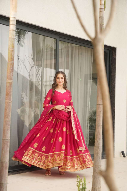 Women’s Ethnic Anarkali Style Floor-Length Gown in Magenta with Golden Zari Embroidery – Festive & Wedding Wear - Dark Pink, L (40)
