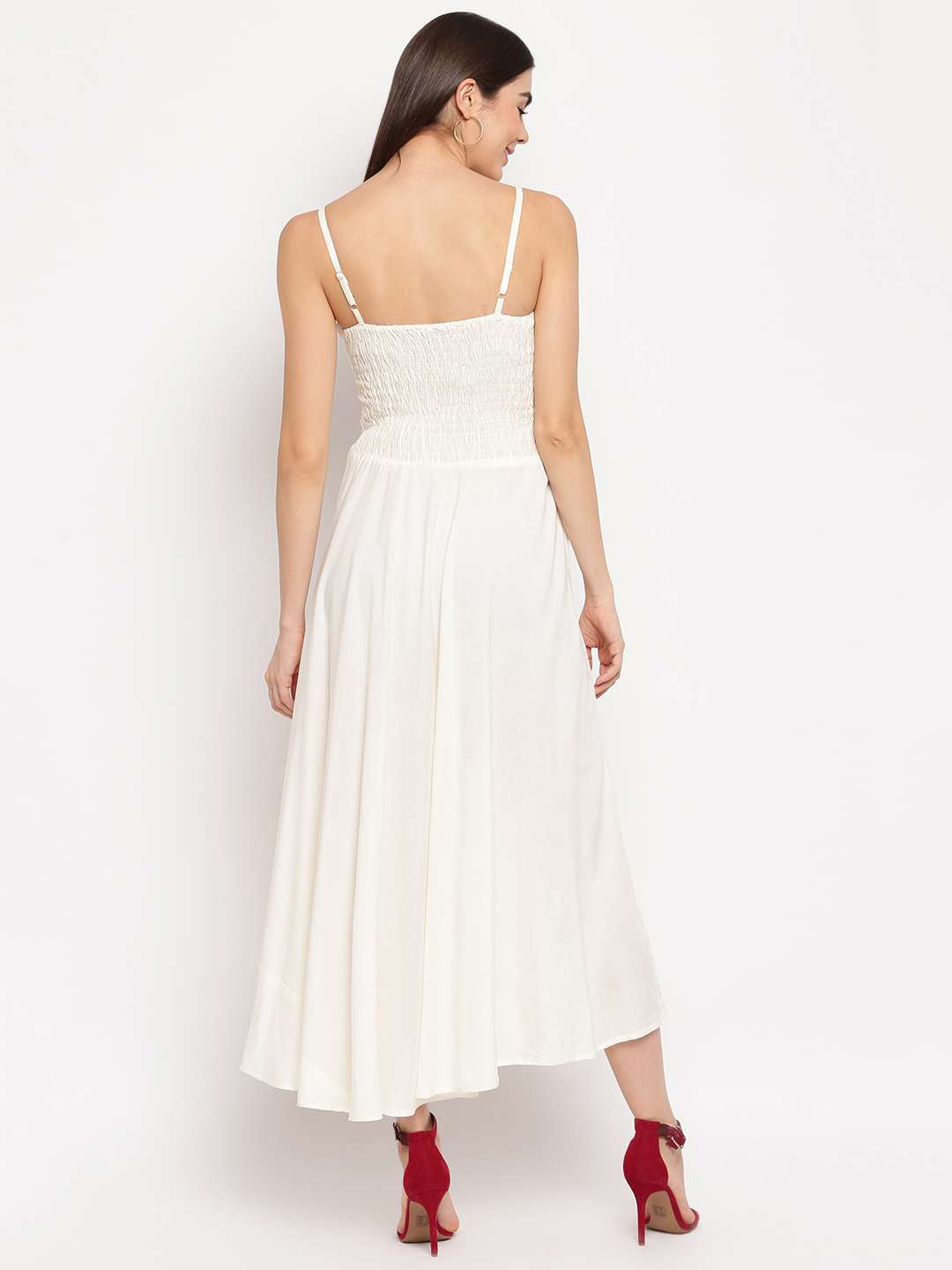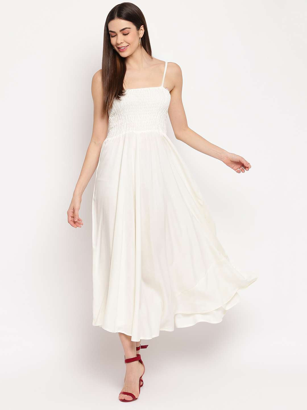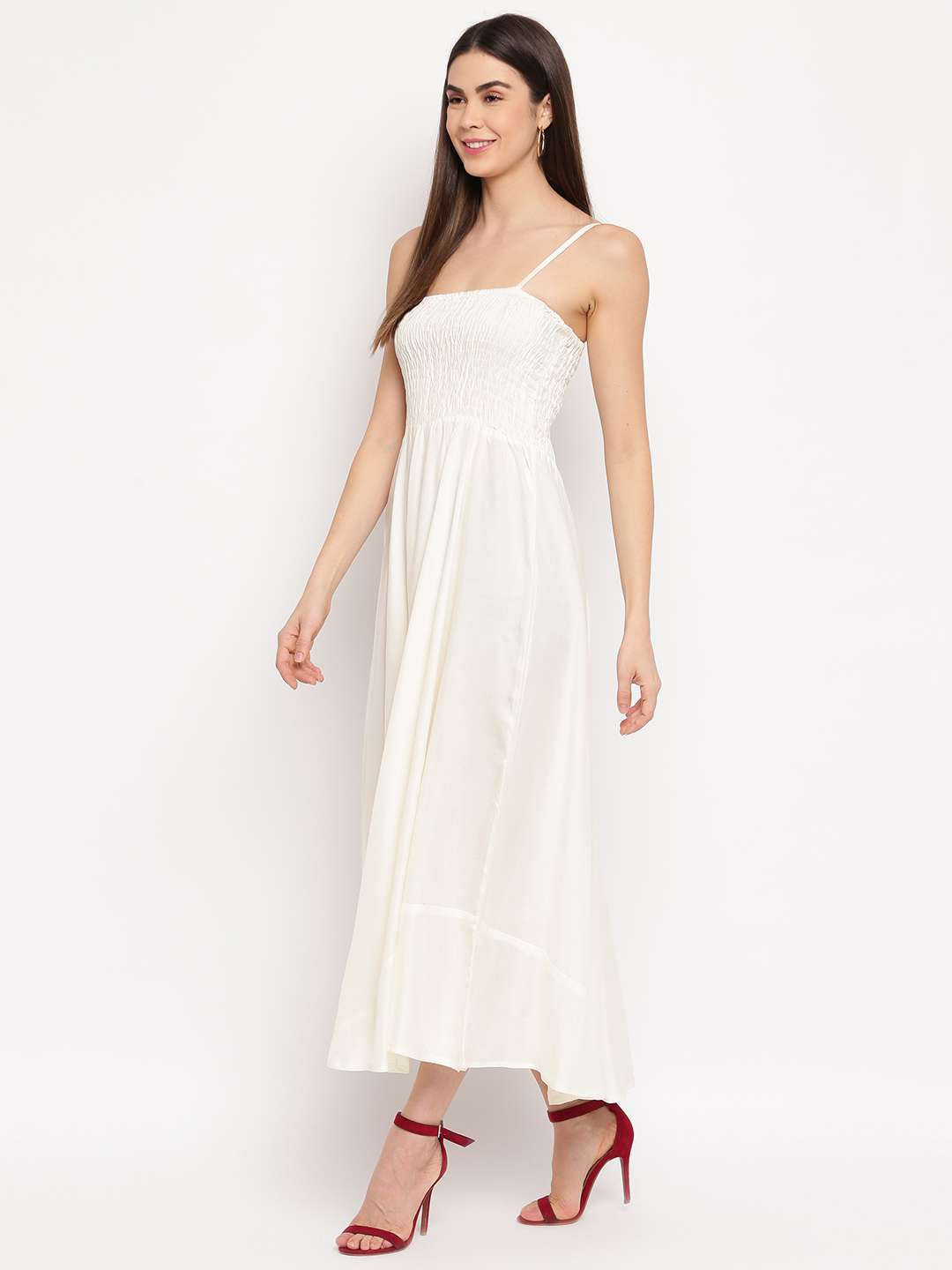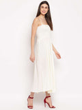 Women's Viscose Rayon Sleeveless Flared Gown Dress in a timeless cream shade. Made from soft and flowy viscose rayon, this gown features adjustable shoulder straps, a flattering sleeveless design, and a beautifully flared hem that moves with grace. Whether you're attending a daytime function, brunch, or an evening out, this dress offers both comfort and charm with minimal effort.